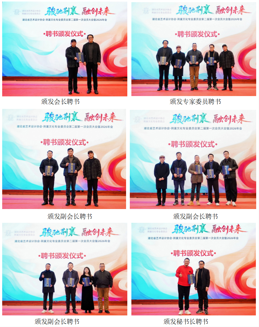 汇报结束后,大会按照湖北省艺术设计协会整体部署,举行了隆重的聘书颁发仪式。现场依次为湖北省艺术设计协会荆襄文化专业委员会新一届会长、副会长、秘书长、理事以及专家委员颁发聘书,一纸聘书,承载着责任与使命,也凝聚着信任与期望。受聘人员手持聘书、神情庄重,纷纷表示将不负重托、履职尽责,团结带领全体会员凝心聚力、锐意进取,共同推动荆襄文化专业委员会工作再上新台阶,助力湖北艺术设计产业高质量发展。